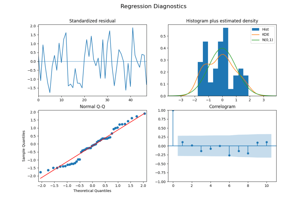 The regression diagnostics indicate that the model is not missing any major dynamics in the data. The standardized residuals are centered on zero, and do not show significant autocorrelation. This time the residuals are more bimodal than in the past, this shows up in the histogram, and as a deviation from the linear pattern in the Q-Q plot at the -1 and +1 Theoretical Quantiles. None of the lags on the Correlogram are statistically significant.