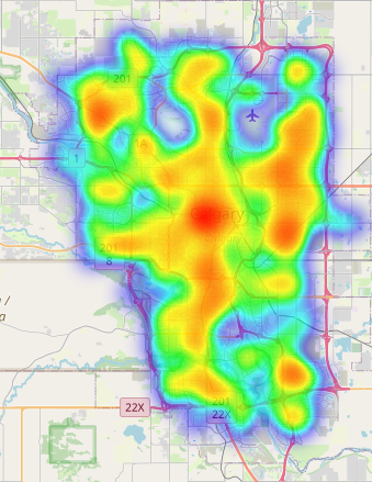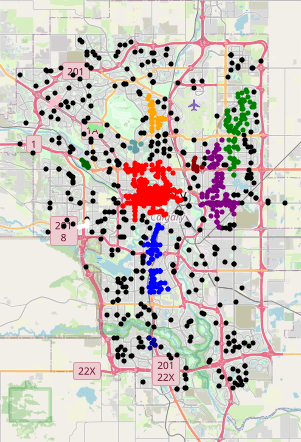 The clusters have changed a little bit, I wonder if there is some sort of seasonal variation in the location of incidents. There no longer appears to be a distinct cluster around the Somerset/Bridalwood LRT station – that might be an artifact of the data though.
