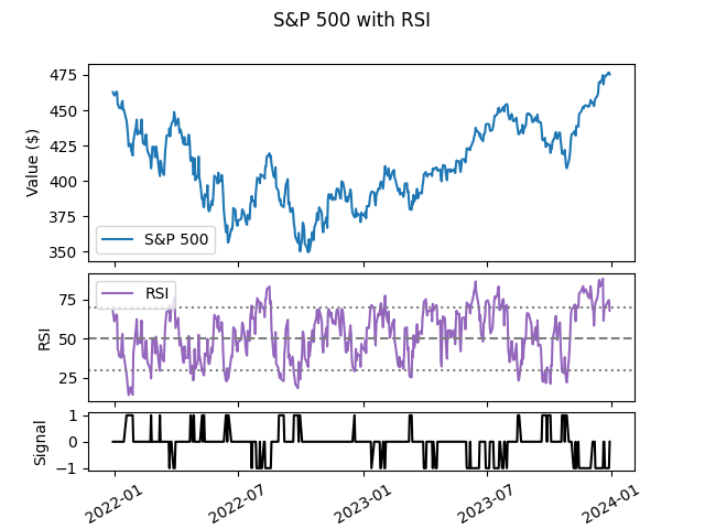 The trade signal in the bottom figure takes a value of 1 (buy) when the RSI is below 30, a value of 0 (hold) when the RSI is between 30 and 70, and a value of -1 (sell) when the RSI is above 70.