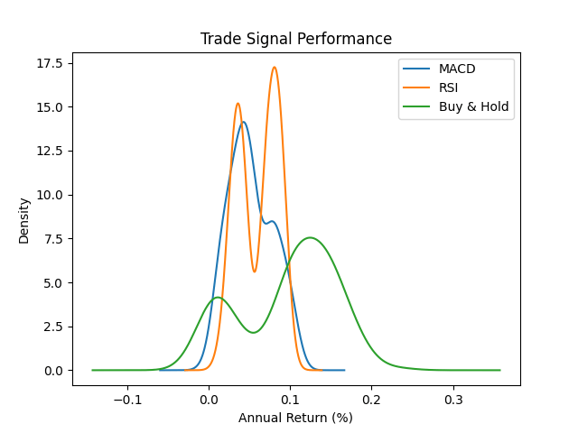 The MACD and RSI do not perform well over any of the periods tested. Using these on their own as a trade signal can actively reduce returns – not what we want in our trading system.