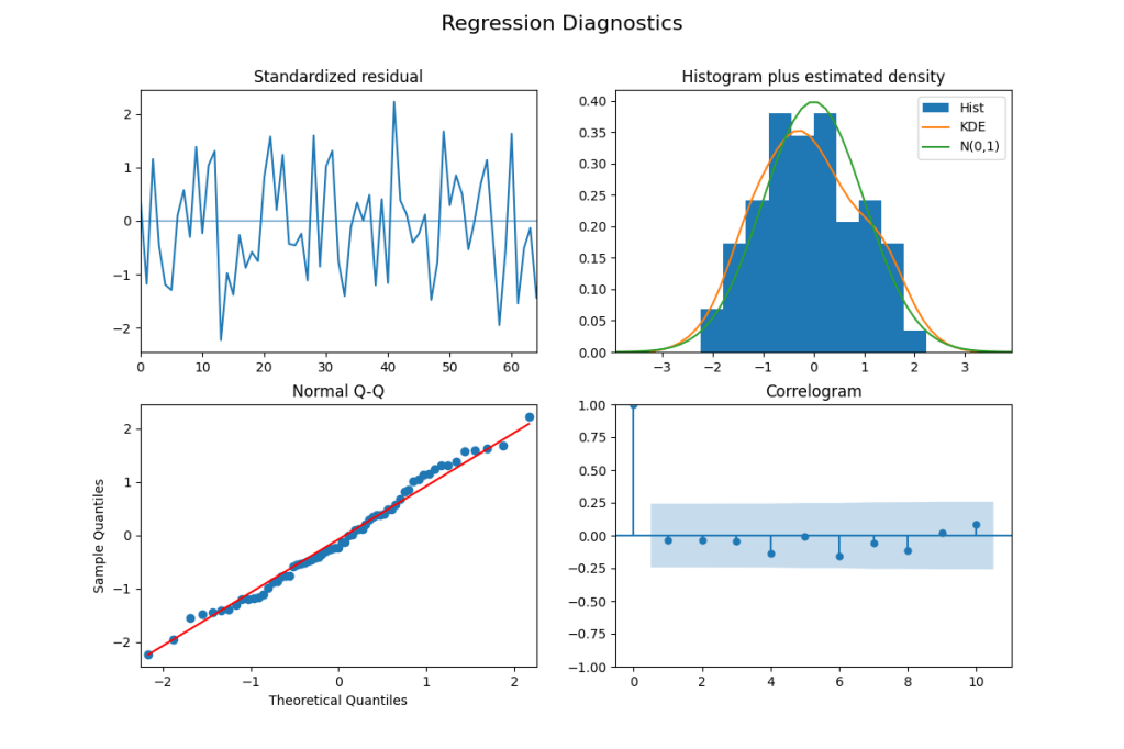 The regression diagnostics indicate that the model is not missing any major dynamics in the data. The standardized residuals are centered on zero, and do not show significant autocorrelation. As with last month, the residuals are more bimodal than in the past, this shows up in the histogram, and as a deviation from the linear pattern in the Q-Q plot at the -1 and +1 Theoretical Quantiles. None of the lags on the Correlogram are statistically significant.