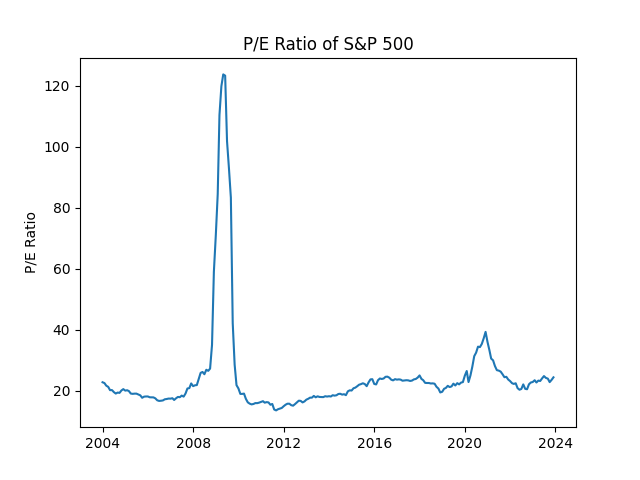The mean P/E over this time was 24.45 with a standard deviation of 16.42. There were notable excursions from the mean in 2009 and 2020. In 2009 the P/E was over 100, and in 2020 the P/E reached 40. In both cases there were significant declines in earnings as a result of the subprime crisis and the COVID-19 pandemic. Earnings appear in the denominator; small values can quickly send the ratio shooting off towards infinity.