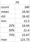 We will use a linear regression to determine the relationship between 1-year forward returns and P/E. One of the key assumptions in linear regression is that our data be (roughly) normally distributed. The P/E data is much too skewed for the regression to be valid. The fit looks like this: