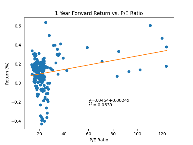 The equation is telling us that for every 1 unit increase in P/E we should expect and additional 0.2% annual return. The result does not match our intuition that low P/E ratios should be associated with high returns. Those outliers are having an outsized impact on our model.