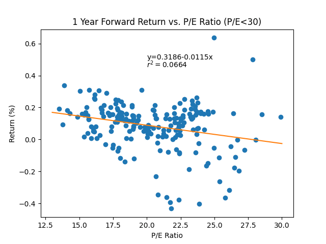 The above analysis showed that there is a relationship between the Price-to-Earnings ratio and one year forward returns. The relationship is weak and there are many (unknown) factors that were excluded from the analysis. I will continue to develop this analysis in future posts, so, as always, stay tuned!
